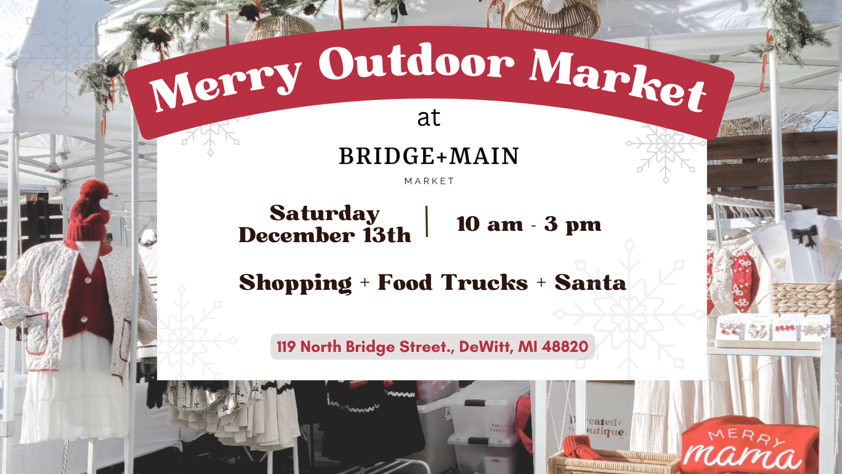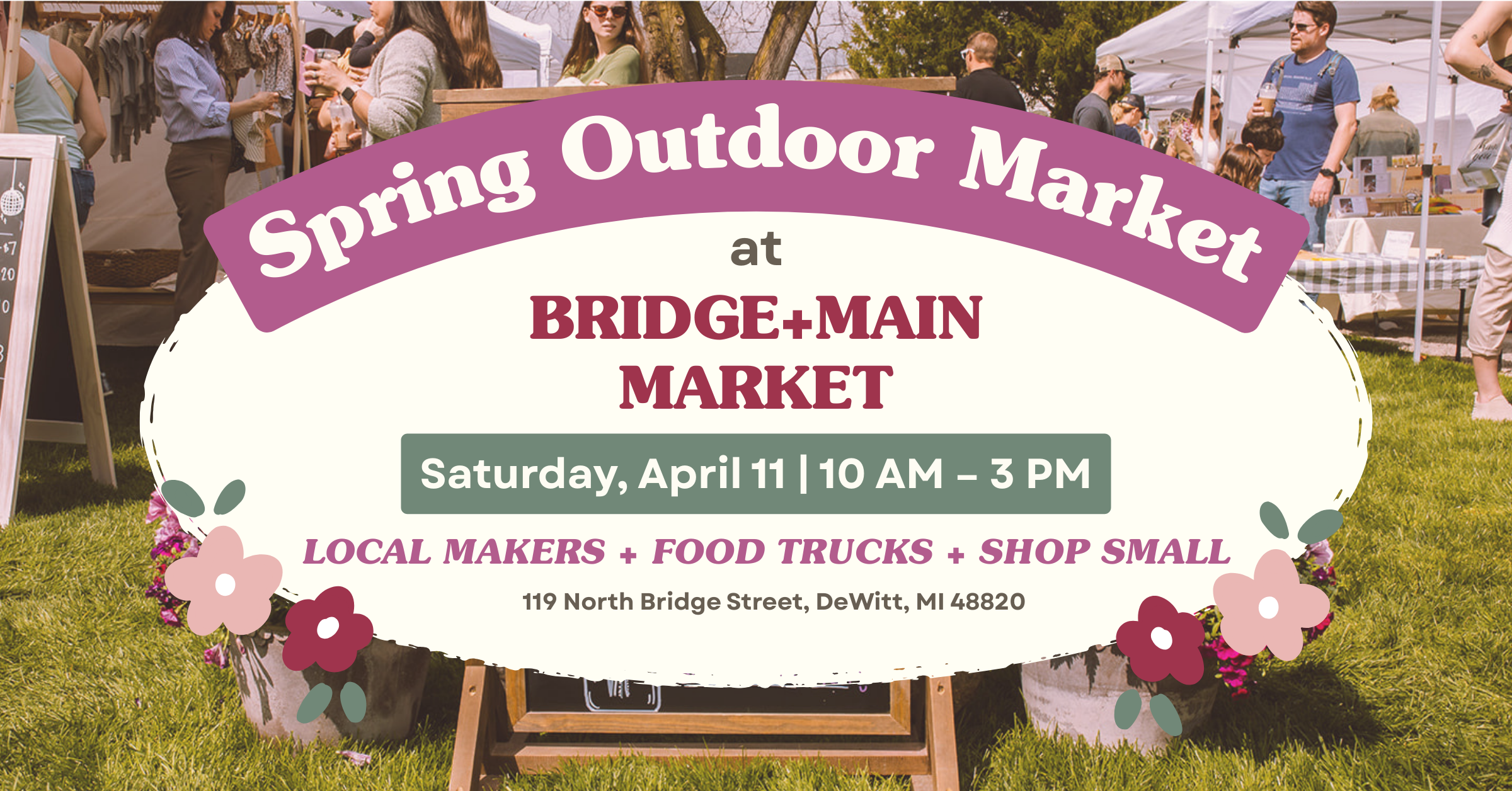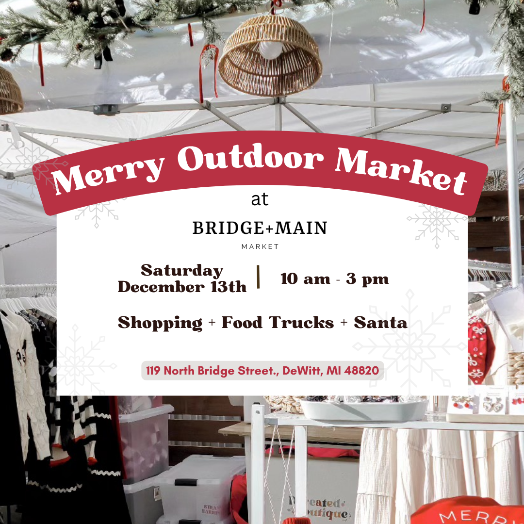 Bridge + Main Market hosts monthly markets and events featuring Michigan makers, handmade goods, and local small businesses — all in the heart of downtown DeWitt, Michigan.
