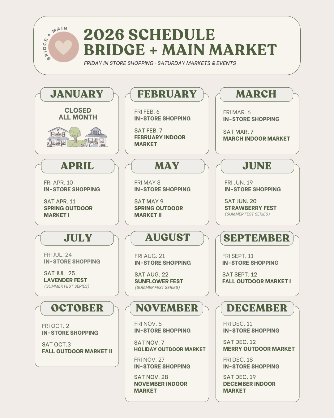 Our shops are open during scheduled monthly market weekends throughout the year