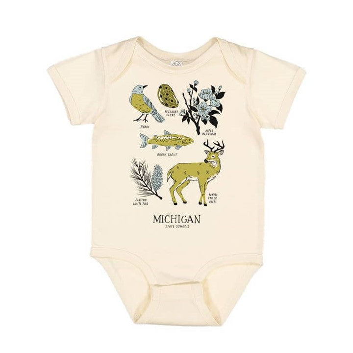 This fun Michigan-themed onesie celebrates the official state symbols of the Mitten State and is printed on a soft and cozy 50% poly, 50% ring-spun cotton onesie that is easy to clean, resistant to shrinkage, and sure to keep little tykes comfortable and happy!